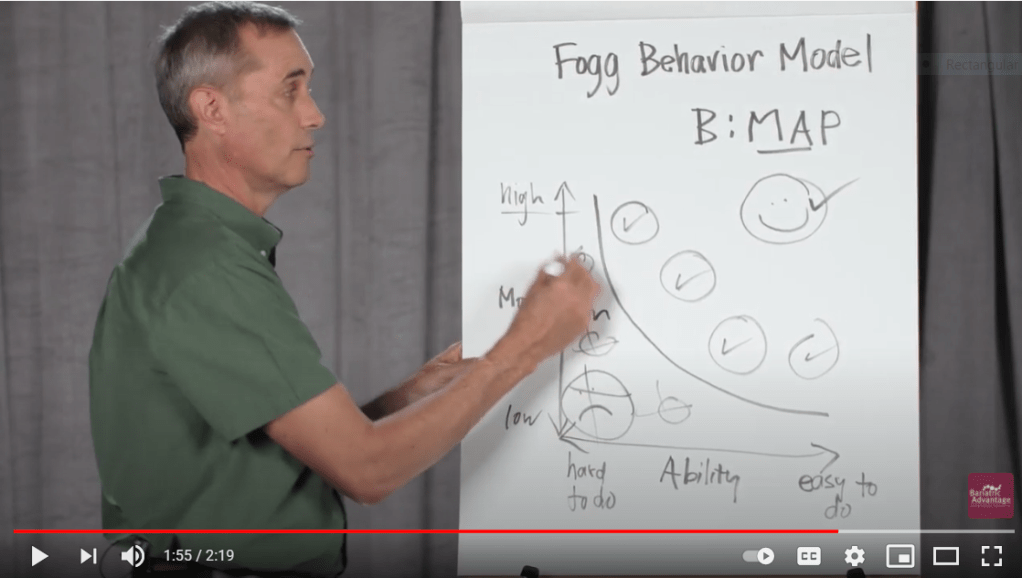 We’ll begin with a quick description using a wonderful tool I discovered some time ago. The wonderful tool is called the Fogg Behavior Model, created by Brian Jeffrey Fogg, PhD. In less than 2 minutes the video below will outline the model, which is rooting in your M-A-P.